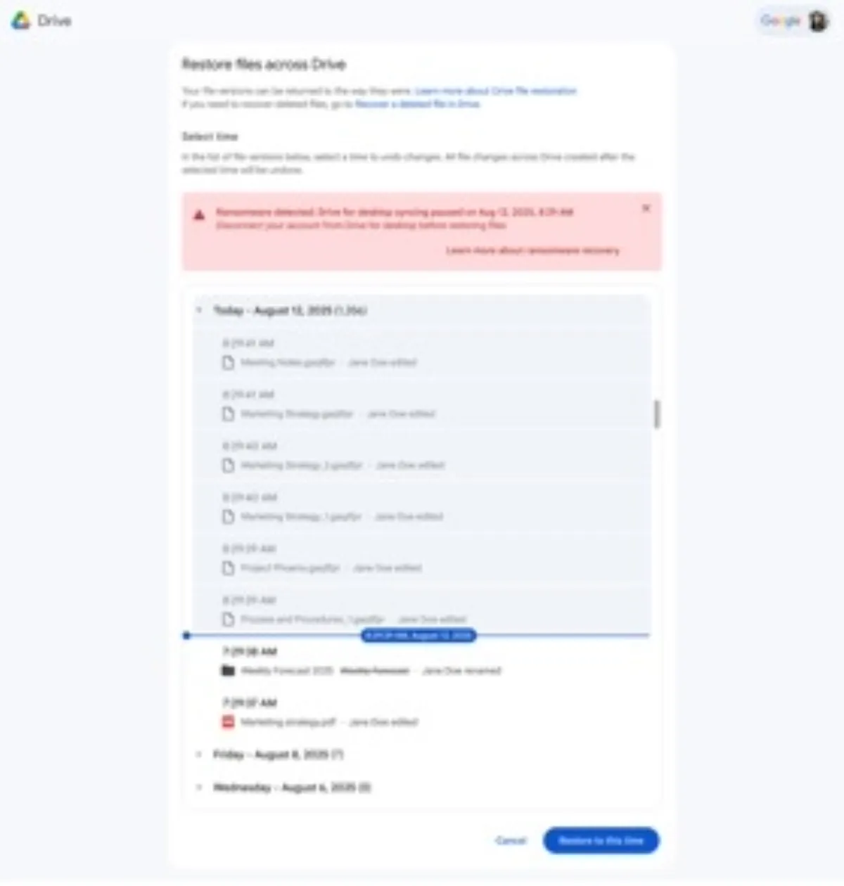 While native Workspace documents (e.g., Google Docs, Sheets) are not impacted by ransomware and ChromeOS has never had a ransomware attack, ransomware is a persistent threat for other file formats (e.g., PDF, Microsoft Office) and desktop operating systems (e.g., Microsoft Windows). That's why we're enhancing Google Drive for desktop with AI-powered ransomware detection to automatically stop file syncing and allow users to easily restore files with a few clicks.