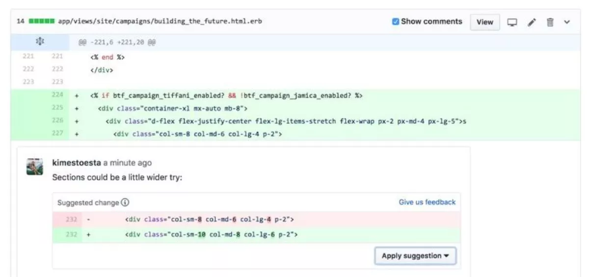 "Collaboration is key to building better software, faster. Now your collaborators can suggest, edit and accept changes inline with a single click. No more copy pasting and moving between tools to accept suggestions.