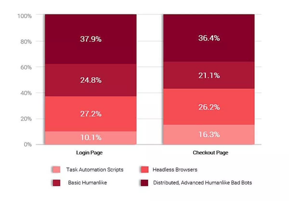 The bad bots that perform online frauds are highly sophisticated and can mimic human behaviour. According to the Big Bad Bot Problem 2020 report, 62.7% of bad bots on the login page can mimic human behaviour. That means these bots can take over user accounts or can even create fake accounts to perform carding or cashing out attacks. Similarly, 57.5% of bad bots on the checkout page can simulate human behaviour when performing carding attacks.